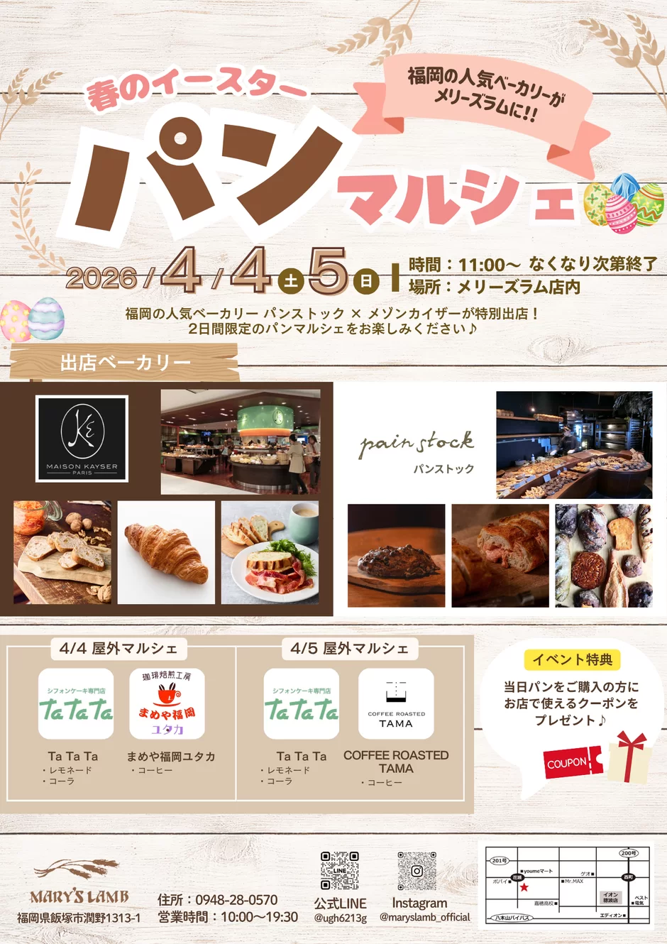 今回のマルシェは、飯塚市潤野にある「メリーズラム」の店内で開催されます。開催日は2026年4月4日(土)と4月5日(日)で、開始時間は両日とも11時からとなっています。